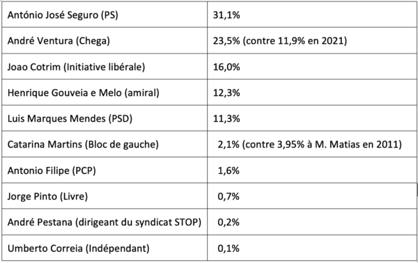 La nette victoire de Seguro sur Ventura n’autorise cependant aucune euphorie. En fait, il faut tenir compte de l’ascension fulgurante de ce dernier depuis l’élection législative de 2019, où il avait été élu comme seul député de son parti avec 67 826 voix seulement (1,29 % des suffrages). Sept ans plus tard, Chega est devenu le deuxième parti du parlement et son candidat aux présidentielles a battu de très loin les autres candidats de la droite, y compris celui du gouvernement. En plus, au deuxième tour, il peut aujourd’hui revendiquer un pourcentage de voix supérieur à celui qui a fait élire le gouvernement minoritaire de la droite conservatrice et, de ce fait, lui disputer le rôle de principal dirigeant de la droite.