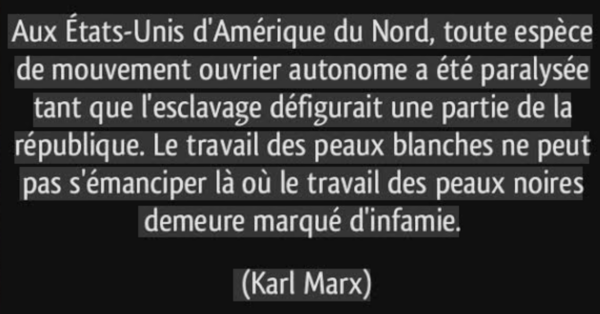 Marx avait une vision radicale qui lui a permis de comprendre bien avant ses camarades socialistes que si le travail devait s’émanciper pleinement, il devait fonder sa cause sur la mort de l’esclavage. L’abolition n’était pas seulement moralement juste, mais aussi politiquement nécessaire. McNally cite le célèbre passage de Marx tiré du chapitre central « La journée de travail » du premier volume du Capital : « Le travail sous peau blanche ne peut s’émanciper là où le travail sous peau noire est stigmatisé et flétri. Mais la mort de l’esclavage fit éclore immédiatement une vie nouvelle. Le premier fruit de la guerre fut l’agitation des huit heures, qui courut, avec les bottes de sept lieues de la locomotive, de l’océan Atlantique à l’océan Pacifique, depuis la Nouvelle-Angleterre jusqu’en Californie. [18]. »