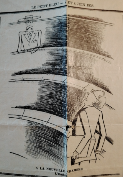 LB : J’ai commencé le livre sur une archive de Blum, un brouillon, où il explique justement cette distinction entre la prise du pouvoir, c’est-à-dire à ses yeux la conquête révolutionnaire du pouvoir d’une part, et d’autre part, l’exercice du pouvoir, c’est-à-dire son occupation légaliste. Ça va être un enjeu absolument fondamental. Et le livre se termine en effet, comme tu l’as décrit, par, un dessin de presse que j’ai trouvé absolument éloquent sur cette division, ce déchirement et même ces tourments qui peuvent être éprouvés par les dirigeants du Front populaire. Il y a d’un côté le Blum militant, dirigeant, député socialiste qui, à certains égards, se voulait encore révolutionnaire ; qui disait qu’à ses yeux le socialisme ne pouvait pas être uniquement réformiste, mais devait rester révolutionnaire. À l’image, ce Blum observe l’autre, le tout nouveau président du Conseil. Ils se regardent de manière muette. Que va-t-il faire ?
