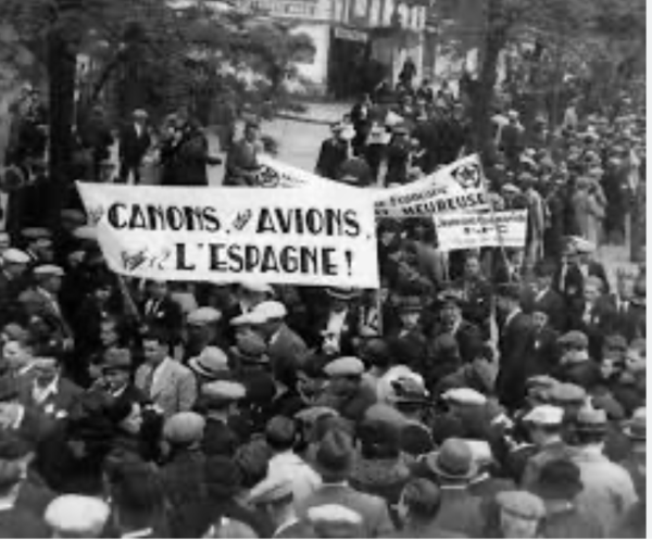 LB : On l’a dit tout à l’heure, le Front populaire est avant tout un front antifasciste, qui s’accompagne d’un programme social pour offrir une alternative à l’emprise de la fascisation. Ce front analyse aussi — du moins dans ses composantes les plus radicales — que le fascisme est véritablement « l’Internationale de la mort », pour reprendre une expression de Daniel Guérin, alors militant à la Gauche révolutionnaire au sein du Parti socialiste.