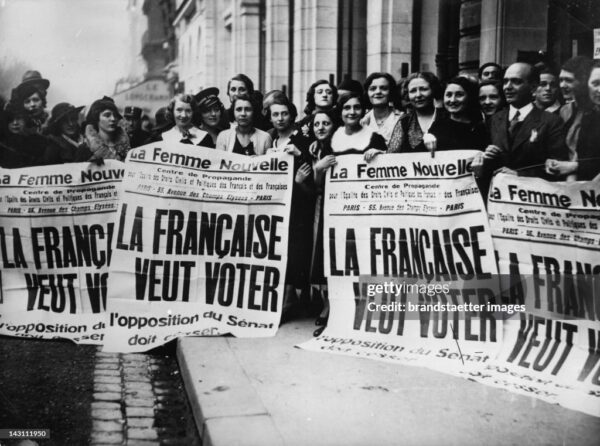 FRANCE – CIRCA 1935: Young French feminists demonstrate with the posters that state: « French Women want to vote ». Paris. Photograph. Around 1935. (Photo by Imagno/Getty Images)