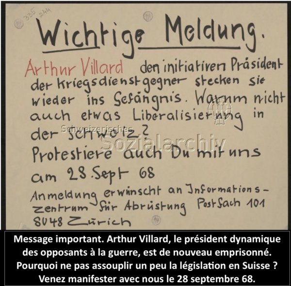 Dès le milieu des années 60, l’institution militaire traverse une sérieuse crise. Le nombre d’objecteurs de conscience croît rapidement — de 22, en 1956, à 36 en 1960, à 77 en 1965, et à 133, en 1969. [5] Condamnés à des peines de prison, ils revendiquent la possibilité de faire un service civil, soutenus par la section suisse de l’Internationale des résistants à la guerre (IRG), qu’anime notamment le socialiste chrétien biennois Arthur Villard.