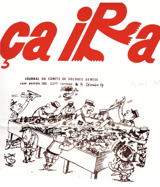 Sa description des événements de l’été est éloquente : des soldats de l’École de recrues san[itaires] 239 de Lausanne ont lancé des fusées des fenêtres d’un dortoir ; un adjudant est arrivé sur les lieux et s’est fait traiter de nazi, alors que la chambrée entonnait l’Internationale ; deux compagnies seront déplacées à Glaris. À Genève, malgré l’arrestation de quatre meneurs de l’École de recrues P[rotection] A[érienne] 246, et de quatre personnes qui distribuaient des tracts devant la caserne, 113 hommes signent une lettre ouverte réaffirmant « leur solidarité totale avec les civils et les soldats arrêtés ». [10] Même le Times de Londres en parle… (Journal de Genève, 7 déc. 1972 ; Tout Va Bien, nov. 1972).