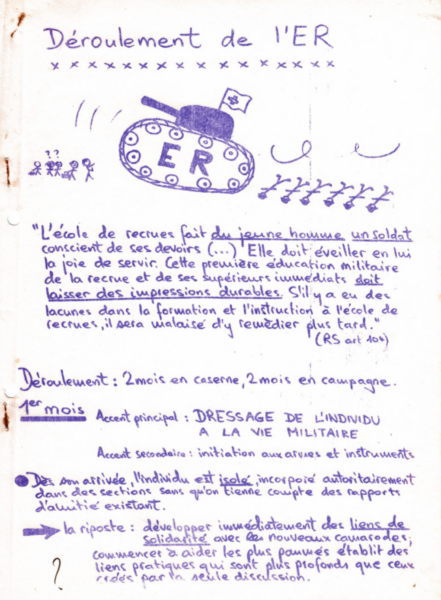 « Avec des camarades du RGB [Revolutionäre Gruppe Basel], j’ai fondé un comité de soldats à Bâle en 1973. Avec le soutien de la RAZ [Revolutionäre Aufbauorganization Zürich] et de membres du Conseil pour la paix, grâce à une tournée en Suisse alémanique, nous avons promu l’idée des comités de soldats. Malgré la répression de la justice militaire, des comités se sont formés dans les grandes villes, qui pouvaient débattre et faire le bilan de leurs engagements et de leurs actions en “coordination nationale”. Le point culminant a été la récolte de signatures en faveur de la pétition contre l’obligation de grader. Elles ont pu être recueillies dans plus de la moitié des écoles de recrues […], ce qui témoigne de la diffusion des comités et de l’auto-organisation des recrues au sein de l’armée. » (Aehmo-Al, 2016).