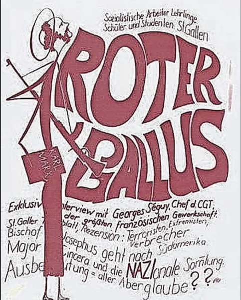 En novembre de la même année, le deuxième numéro du journal alternatif saint-gallois Roter Gallus, est illustré par un tank arborant la croix suisse, accompagné d’une légende adaptée librement d’un texte de Wolgang Borchert : « Toi, homme du village et homme de la ville. Lorsqu’ils viendront demain avec leur ordre de marche, une seule chose : non ! ». Cette feuille sera saisie par la justice, puis le procureur de la Confédération s’emmêlera, si bien que son rédacteur, Christian Schmid, sera condamné à une semaine de prison avec un sursis sur deux ans et à 1400 francs d’amende. [9]