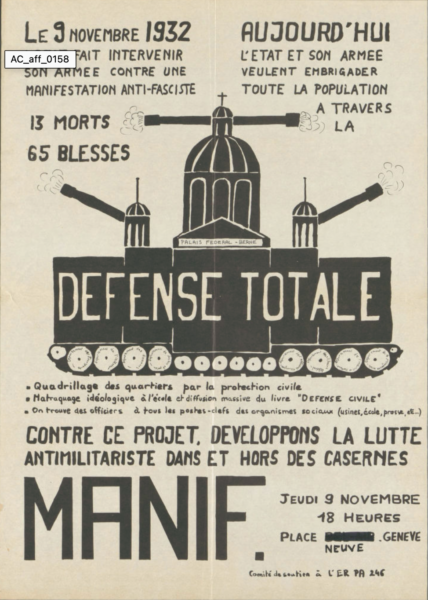 En lien avec les sentiments pacifistes et antimilitaristes, le souvenir des événements de novembre 1932 à Genève, où l’armée, appelée en renfort par les autorités cantonales pour protéger un meeting d’extrême droite, auquel participe d’ailleurs un conseiller d’État, a ouvert le feu sur la foule, tuant 13 personnes et en blessant une centaine, débouche aussi sur une commémoration mouvementée, dont je garde un vif souvenir. [7] Dès 18 heures, 3 000 manifestants défilent dans les rues de Genève, de la place Neuve aux Eaux-Vives, à l’appel de la gauche extra-parlementaire, en scandant : « Guerre à l’armée des patrons ! », « À bas les tribunaux militaires, tribunaux d’exception ! », etc. Elle diffuse aussi à tout va des publications antimilitaristes : Tout va Bien, La Pilule, La Brèche (organe de la Ligue marxiste révolutionnaire — LMR) et La Taupe (bulletin de son organisation de jeunesse), qui met ainsi en cause la défense nationale :
