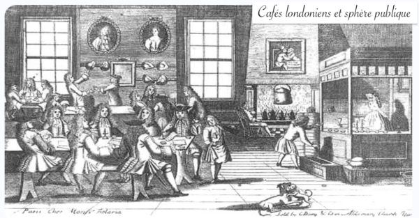 Il y a une soixantaine d’années, Habermas a réalisé un travail pionnier dans ce domaine dans La transformation de la sphère publique (1962). Selon sa thèse, qui n’est pas incontestée, la sphère publique bourgeoise naissante était visible dans les cafés londoniens, lieux importants pour le développement du discours émancipateur. Apprivoisés par les capitalistes, ses impératifs étaient alors liés à ceux de l’industrie culturelle et de son complexe publicitaire.