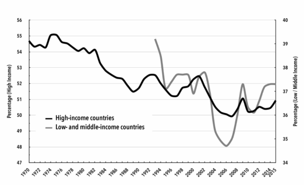 Il n’est guère nécessaire de rappeler que le monde est de plus en plus inégalitaire en termes de revenus, de richesse et d’accès aux ressources et aux services. La baisse de la part des revenus salariaux dans le revenu national total dans presque toutes les économies capitalistes a été largement remarquée et documentée. Les travaux d’Engelbert Stockhammer, Thomas Piketty et d’autres l’ont clairement établi pour le demi-siècle écoulé, ce qui a été confirmé par les données du FMI présentées dans le graphique 1 [7].