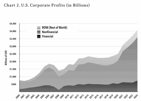 Au niveau mondial, les très grandes entreprises multinationales accaparent la part du lion de tous les bénéfices des entreprises, et cette concentration est évidente, même parmi les quatre mille plus grandes entreprises du monde. De plus, les bénéfices des entreprises américaines ont explosé depuis l’an 2000, malgré des crises périodiques, alors que les entreprises d’autres pays et régions ont obtenu des résultats moins bons en termes de rentabilité.
