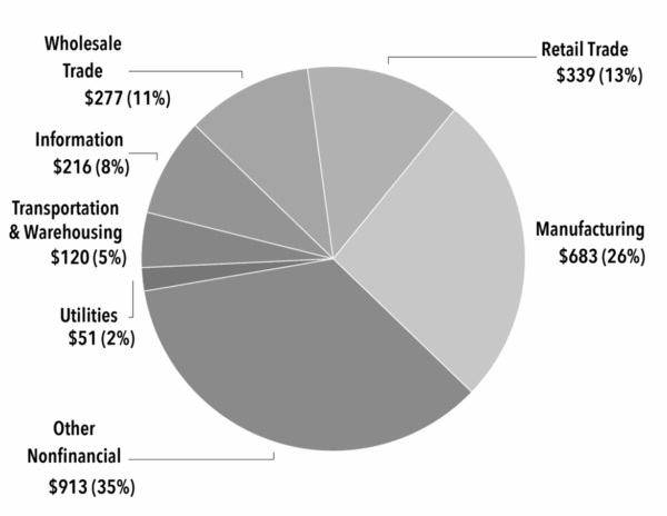 Le graphique 2 montre les bénéfices totaux de toutes les entreprises aux États-Unis. L’augmentation de la rentabilité a été particulièrement marquée parmi les entreprises non financières, tandis que les bénéfices totaux des entreprises financières ont fluctué davantage et n’ont pas augmenté de manière aussi spectaculaire. Au sein des entreprises non financières, au cours de la période la plus récente (2022-2024), le graphique 3 montre que la majeure partie des bénéfices provient de l’industrie manufacturière et du commerce, tant de gros que de détail. (Il convient de noter que, dans le cas du commerce, comme de nombreuses grandes entreprises sont présentes à la fois dans le commerce de gros et dans le commerce de détail, il est souvent difficile de les distinguer.) Ensemble, ces deux secteurs ont représenté la moitié des bénéfices totaux des entreprises aux États-Unis.
