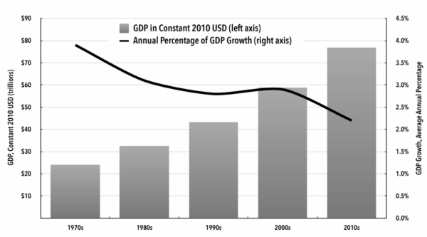 La croissance du PIB n’est certainement pas un indicateur adéquat ou réaliste du progrès humain, ni même du progrès purement matériel. Mais c’est nécessairement l’objectif du capitalisme, dont la raison d’être est l’expansion croissante de l’activité économique commercialisée et, par conséquent, des profits. « Accumulez, accumulez ! C’est Moïse et les prophètes », comme l’a déclaré Marx dans le premier volume du Capital, y voyant la force motrice du capitalisme en général. Il convient donc de noter qu’au cours du dernier demi-siècle, la croissance du PIB mondial a globalement ralenti (voir graphique 4).