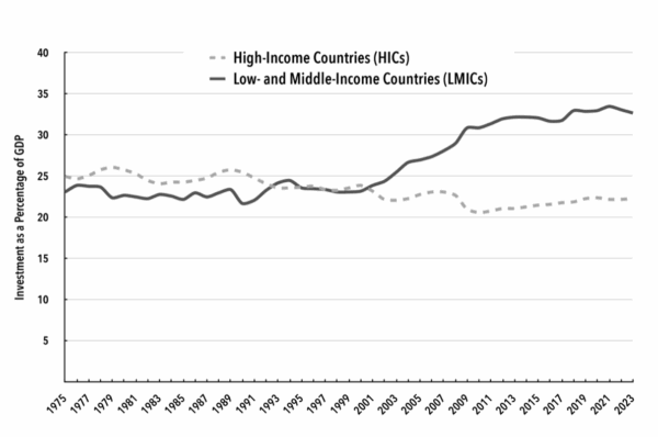 Les graphiques 5 et 6 dissipent rapidement ces idées. Les taux d’investissement dans les pays à revenu élevé (ou « économies avancées », comme ils ont tendance à s’appeler eux-mêmes) sont en baisse moyenne depuis au moins trois décennies et sont restés stagnants à des niveaux bas au cours de la dernière décennie. En revanche, les taux d’investissement dans les pays à faible et moyen revenu ont augmenté rapidement au cours du dernier quart de siècle en particulier, de sorte qu’ils sont désormais en moyenne environ une fois et demie supérieurs à ceux des pays riches.