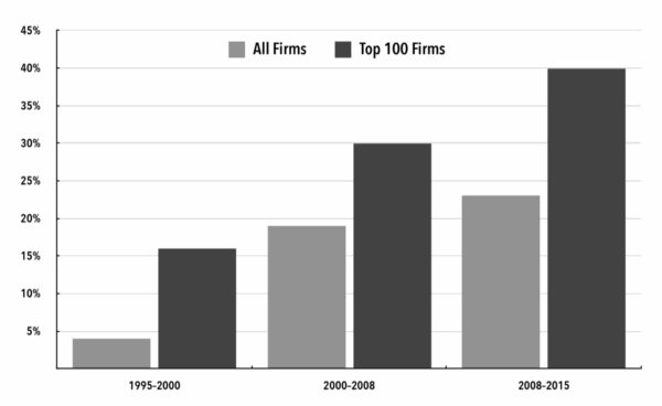 Le graphique 7, qui présente les résultats de cette étude, indique qu’un tel processus de transformation des bénéfices excédentaires temporaires en rentes est effectivement en cours. Au cours de la dernière période étudiée, soit 2009-2015, 40 % des bénéfices des cent premières entreprises de la base de données étaient « excédentaires », c’est-à-dire nettement supérieurs aux bénéfices de référence. Cette augmentation progressive suggère qu’il s’agissait déjà en fait de rentes plutôt que de bénéfices excédentaires temporaires.