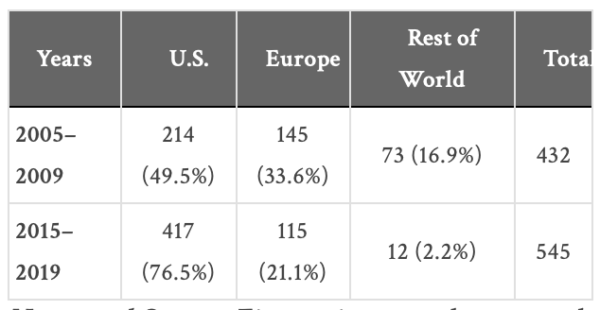 Une autre étude portant sur les quatre mille premières entreprises mondiales fournit des résultats encore plus frappants (voir tableau 1) [9]. Les quatre mille premières entreprises mondiales sont dominées par les entreprises américaines, non seulement en termes de bénéfices, mais également pour ce qui a trait à leur part dans le total des bénéfices de ce groupe, qui a augmenté de manière significative durant la décennie 2005-2009 à 2015-2019.