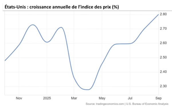 La croissance annuelle de l’indice des prix des dépenses de consommation personnelle aux États-Unis, qui est l’indice des prix que la Réserve fédérale suit pour ses décisions de politique de taux d’intérêt, est passée à 2,8 % en septembre, contre 2,3 % en avril, lorsque Trump a dévoilé ses importants droits de douane sur les importations lors de ce qu’il a appelé le « jour de la libération » – une libération uniquement pour les prix.
