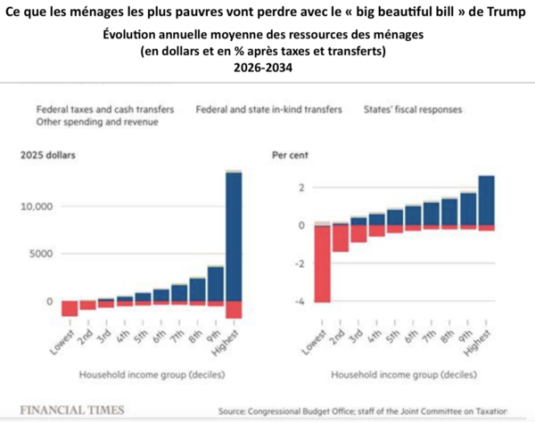 Le président devrait axer sa campagne pour les élections législatives de mi-mandat l’année prochaine, en partie, sur son projet de loi controversé, adopté en juillet, mais qui n’entrera en vigueur qu’en 2026. Si ce texte maintient les réductions d’impôts annoncées lors de son premier mandat, il prévoit également des coupes budgétaires dans les programmes Medicaid et d’aide alimentaire. Le Bureau du budget du Congrès a indiqué que ce projet de loi réduirait probablement les ressources des ménages appartenant au décile le plus pauvre de 1 600 dollars par an, contre une augmentation d’environ 12 000 dollars pour les 10 % les plus riches.