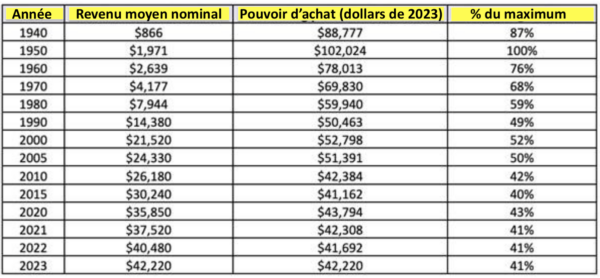 D’une certaine manière, Trent utilise une approche marxiste pour analyser l’impact de l’inflation sur les revenus, c’est-à-dire en se basant sur la valeur mesurée en heures de travail : le temps de travail nécessaire pour acquérir des biens et des services. Cette analyse révèle que pour maintenir le niveau de vie des grands-parents américains en 1950, le revenu médian officiel de 2023, qui s’élevait à 42 220 $, devrait atteindre 102 024 $.