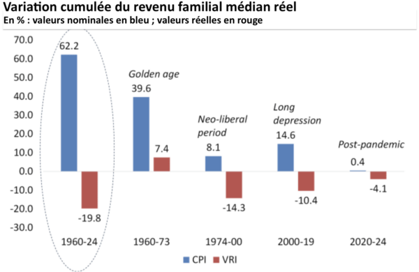 Selon les données officielles, le revenu médian réel des ménages américains a augmenté de 62 % entre 1960 et 2024. Cependant, une fois l’inflation déduite, ce revenu réel était inférieur de 20 % à celui de 1960. En réalité, seule la période dite « âge d’or » (1960-1973) a enregistré une hausse des revenus réels, selon l’indice VRI. Durant la période néolibérale (1974-2000), les revenus réels ont chuté de 14 %, puis de 10 % supplémentaires pendant la Grande Dépression (2000-2019). Après la pandémie, la croissance a été quasi nulle, même d’après les données officielles. Rien d’étonnant, dès lors, au moral des Américains.