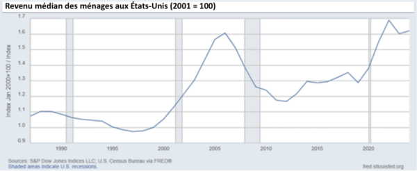 Aux États-Unis, les prix moyens ont augmenté de 23 % depuis 2020, selon les données officielles, et de 26 % selon les données en valeur. Cette hausse a entraîné une baisse du revenu réel moyen des Américains, et ce, de plus en plus marquée pour les plus modestes. Les coûts de Medicare devraient augmenter, les subventions alimentaires sont réduites, la croissance de l’emploi et des salaires s’amenuise et l’inflation repart à la hausse.