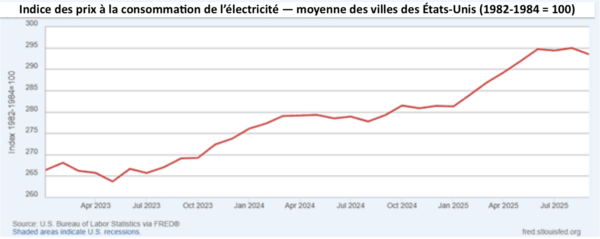 Par ailleurs, la politique anti-immigration brutale de Trump a engendré une grave pénurie de main-d’œuvre dans l’agriculture et le bâtiment, secteurs où les salaires sont bas. Cette situation fait grimper les prix des denrées alimentaires et des matériaux de construction. Surtout, on observe une flambée des prix de l’électricité, alimentée par la demande croissante des centres de données d’IA, grands consommateurs d’énergie. OpenAI consomme autant d’électricité que New York et San Diego réunies, ou encore autant que la Suisse et le Portugal réunis.