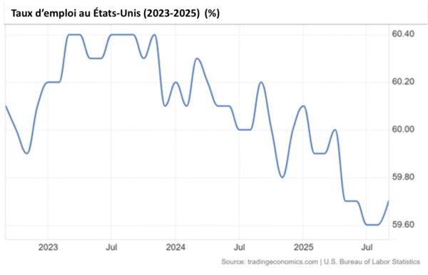 Ce contraste caractérise une économie en « K », où les plus démunis perdent tandis que les plus aisés s’enrichissent. Des chiffres récents confirment cette tendance, la faiblesse du marché du travail et la persistance de prix élevés creusant l’écart entre les hauts et les bas revenus. La croissance américaine repose actuellement en grande partie sur l’intelligence artificielle et les investissements qui y sont liés.
