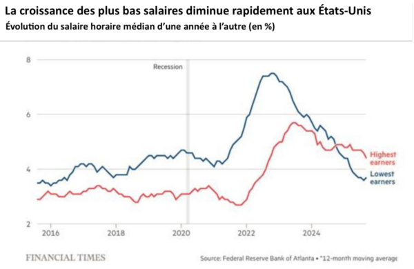 L’analyse des données du Bureau des statistiques du travail réalisée par la Réserve fédérale d’Atlanta montre qu’après des années de croissance supérieure à la tendance, la rémunération des Américains les moins bien payés a ralenti plus fortement que celle des plus aisés, anéantissant une grande partie des progrès accomplis au cours de la dernière décennie pour réduire les inégalités.