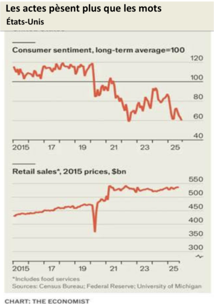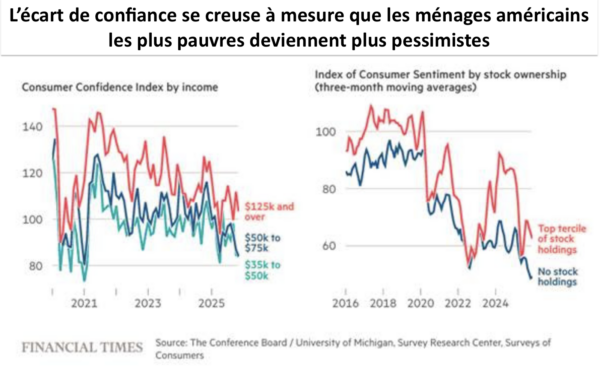 Les ménages les plus modestes ont été durement touchés par le ralentissement de la croissance des salaires et des embauches. Le budget de Trump, baptisé « One Big Beautiful Bill Act », entraînera la perte des aides alimentaires et des subventions pour l’assurance maladie pour de nombreux Américains à faibles revenus. Il n’est donc pas surprenant que la confiance des consommateurs appartenant au tiers des ménages les plus modestes ait chuté à un niveau historiquement bas.