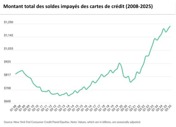 L’endettement croissant des ménages accentue les difficultés financières. La dette des cartes de crédit a atteint 1 300 milliards de dollars cette année, avec un solde moyen de 7 000 dollars. Cette hausse est principalement due à l’augmentation du coût des services de streaming et des appareils électroniques. Les retards de paiement et les saisies de véhicules automobiles sont également en forte augmentation, plusieurs indicateurs dépassant des niveaux jamais atteints lors de la Grande Récession.